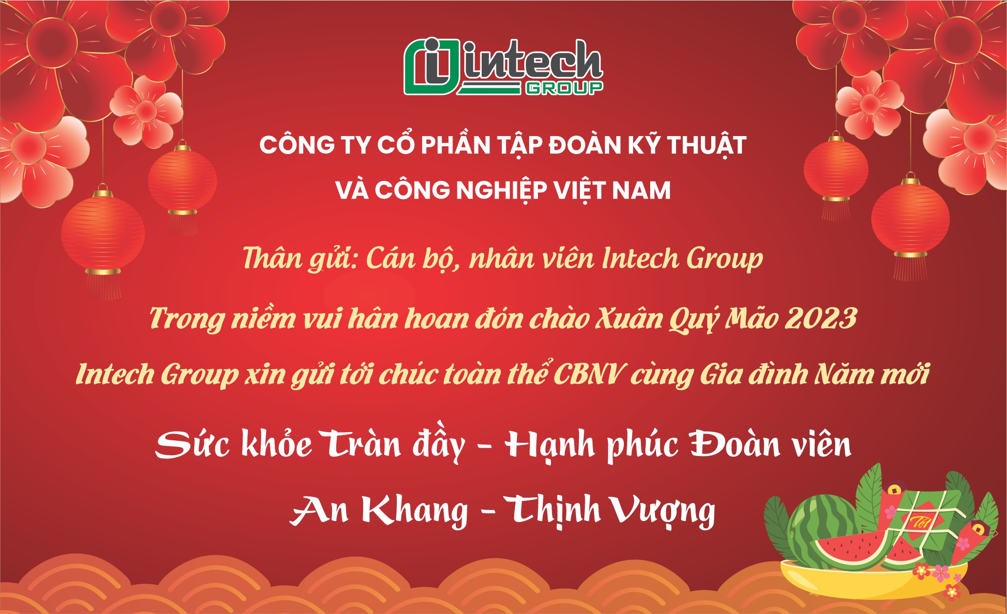 Trong niềm vui hân hoan đón chào năm mới 2023, thay mặt Ban giám đốc, tôi xin gửi tới toàn thể cán bộ, nhân viên Intech Group cùng gia đình lời chúc: sức khỏe dồi dào, hạnh phúc viên mãn và thành công vượt trội.